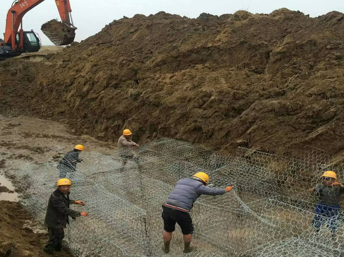 产品加工流程:选取ASTM/EN标准低碳钢丝→高上锌表面处理→PVC/PE/矽胶覆塑→调整机器→上丝→机器编织→人工剪切,组装→抽样检验→折叠打包→运输,运输至工地后的网笼为半成品,施工起来较为方便只需将网笼抻开将石块填充到箱内即可,以块石填充好的防护体不仅稳固性和防冲刷性能较强而且具有很好的生态绿化作用。